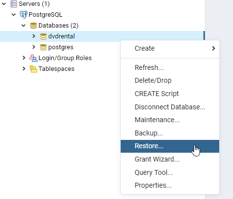 pg_restore.exe -h localhost -U postgres -d dvdrental C:\dvdrental.tar